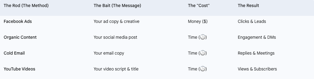 You paid the same amount to cast your line. The quality of your bait determined the result. The same is true for organic content. You can spend 5 hours creating 5 posts. If the message is weak, you might get one response. If the message is powerful, you might get 30. The “cost” in time was the same; the message determined the outcome.