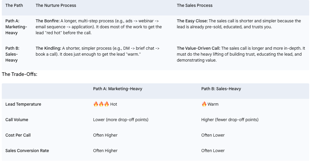 Recommendation: When you are just starting out, it is almost always better to choose Path B (Sales-Heavy). A shorter nurture process allows you to start talking to people as quickly as possible. You can only truly know how much “warming up” is required by having actual conversations.